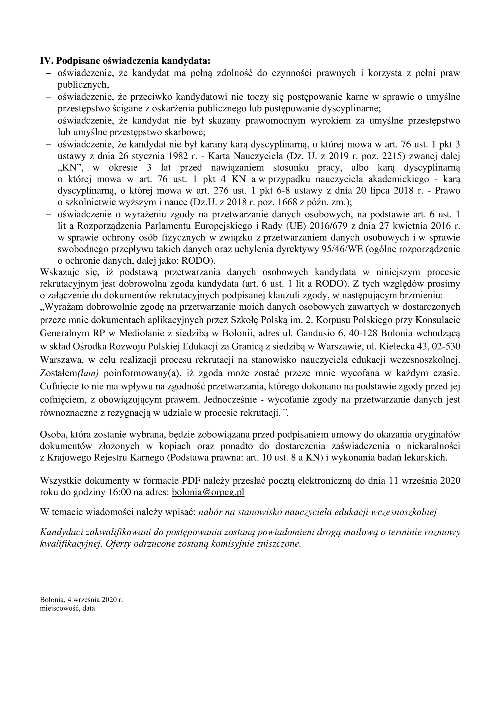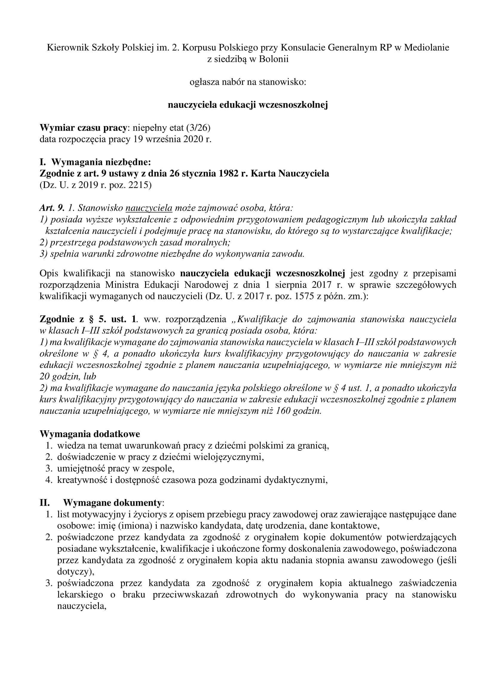 Szanowni Państwo informujemy, że konkurs na nauczyciela edukacji wczesnoszkolnej 16 wreśnia 2020 został rozstrzygniety nauczyciel został wybrany.