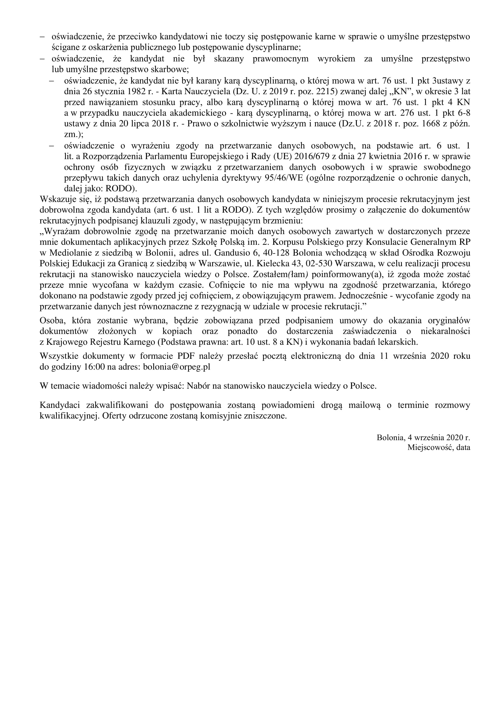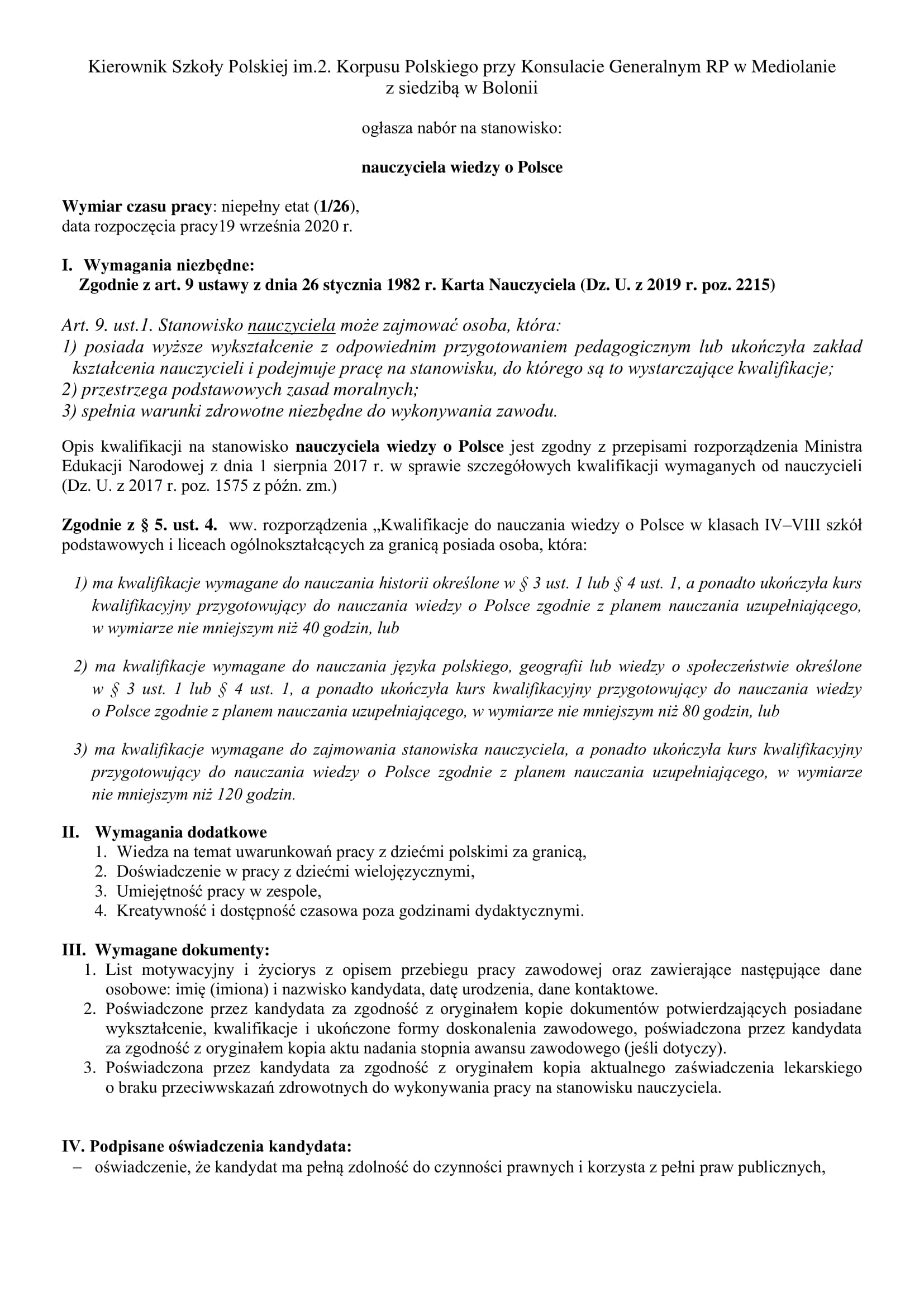 Szanowni Państwo informujemy, że konkurs na stanowisko nauczyciela wiedzy o Polsce 16 września 2020 został rozstrzygnięty nauczyciel został wybrany.