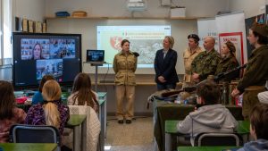 28 marca 2026 roku odbyło się wyjątkowe spotkanie, które udowodniło, że lekcja historii nie musi być jedynie suchym zapisem w podręcznikach. Pod hasłem „W poszukiwaniu historii 2. Korpusu Polskiego” młodzież ze stowarzyszenia „Aquila Bianca” przeprowadziła fascynujące zajęcia, które połączyły uczniów z Bolonii i Częstochowy dzięki technologii online. Stworzyliśmy razem most edukacyjny między Włochami a Polską. Kluczowym punktem programu było połączenie z zaprzyjaźnioną Szkołą Podstawową nr 24 im. Jana Marcina Szancera w Częstochowie. Uczniowie obu placówek wspólnie uczestniczyli w lekcji, wymieniając się doświadczeniami i wspólnie odkrywając historię tego ważnego militarnego działania, które wpłynęło na losy całej Europy. Lekcja została wzbogacona o profesjonalną i poruszającą prezentację multimedialną przygotowaną przez członków „Aquila Bianca”, która stała się tłem dla opowieści o losach żołnierzy generała Andersa.Możemy śmiało nazwać to spotkanie żywą lekcją historii. To nie była zwykła prelekcja. Dzięki ogromnemu zaangażowaniu pasjonatów, uczniowie mogli dosłownie dotknąć historii. Podziwialiśmy a nawet przymierzaliśmy mundury i ekwipunek w postaci oryginalnych strojów żołnierskich oraz hełmy z epoki. Na sali pojawiły się elementy uzbrojenia i amunicji pozbawionych cech bojowych. Najwięcej uwagi przykłuł unikatowy eksponat – oryginalna skrzynia, którą wyobrażaliśmy sobie, osobiście pomagał nosić najsłynniejszy żołnierz jednostki, kapral Wojtek. Dzięki tym rekwizytom uczestnicy mogli poczuć ciężar żołnierskiej doli i realia frontowe II wojny światowej. Niezwykle wzruszającym punktem programu była opowieść Jessiki Mazur – uczennicy naszej szkoły, a zarazem aktywnej członkini stowarzyszenia „Aquila Bianca”. Jessica przybliżyła zebranym niesamowite losy niedźwiedzia syryjskiego, który stał się symbolem 2. Korpusu Polskiego. „Historia Wojtka to droga od małego niedźwiadka odkupionego od perskiego chłopca, przez trudy bitwy o Monte Cassino, aż po zasłużoną, choć nostalgiczną emeryturę w edynburskim zoo” – opowiadała Jessica.