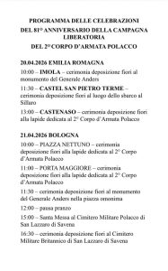 Strona główna / Aktualności / Program obchodów 81. Rocznicy Wyzwolenia Bolonii przez Żołnierzy 2. Korpusu Polskiego
